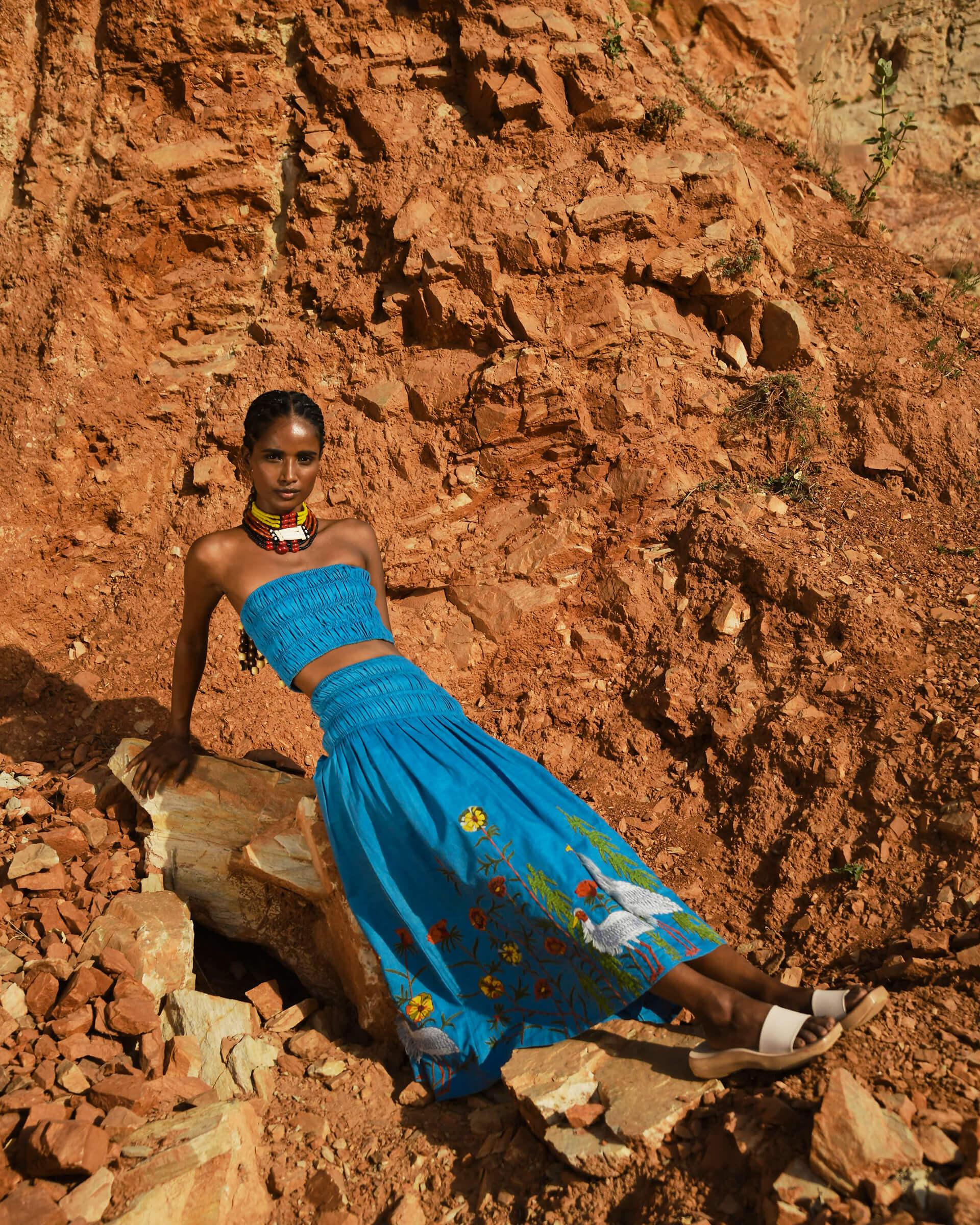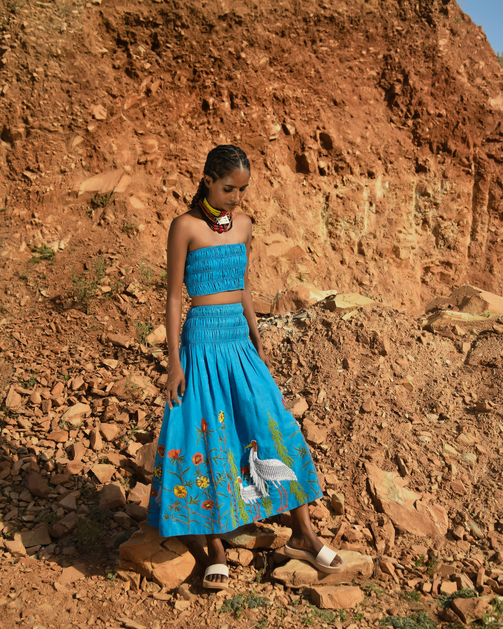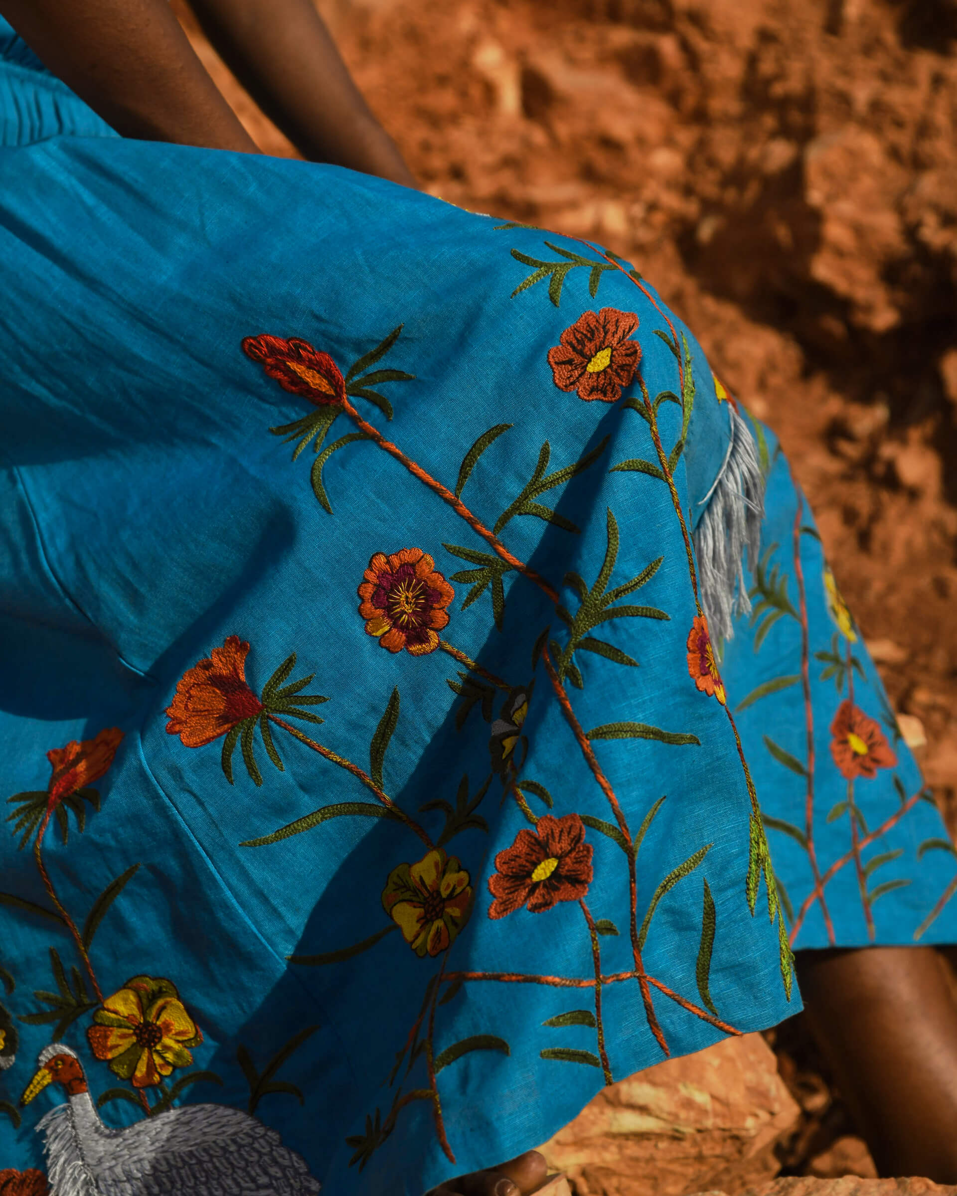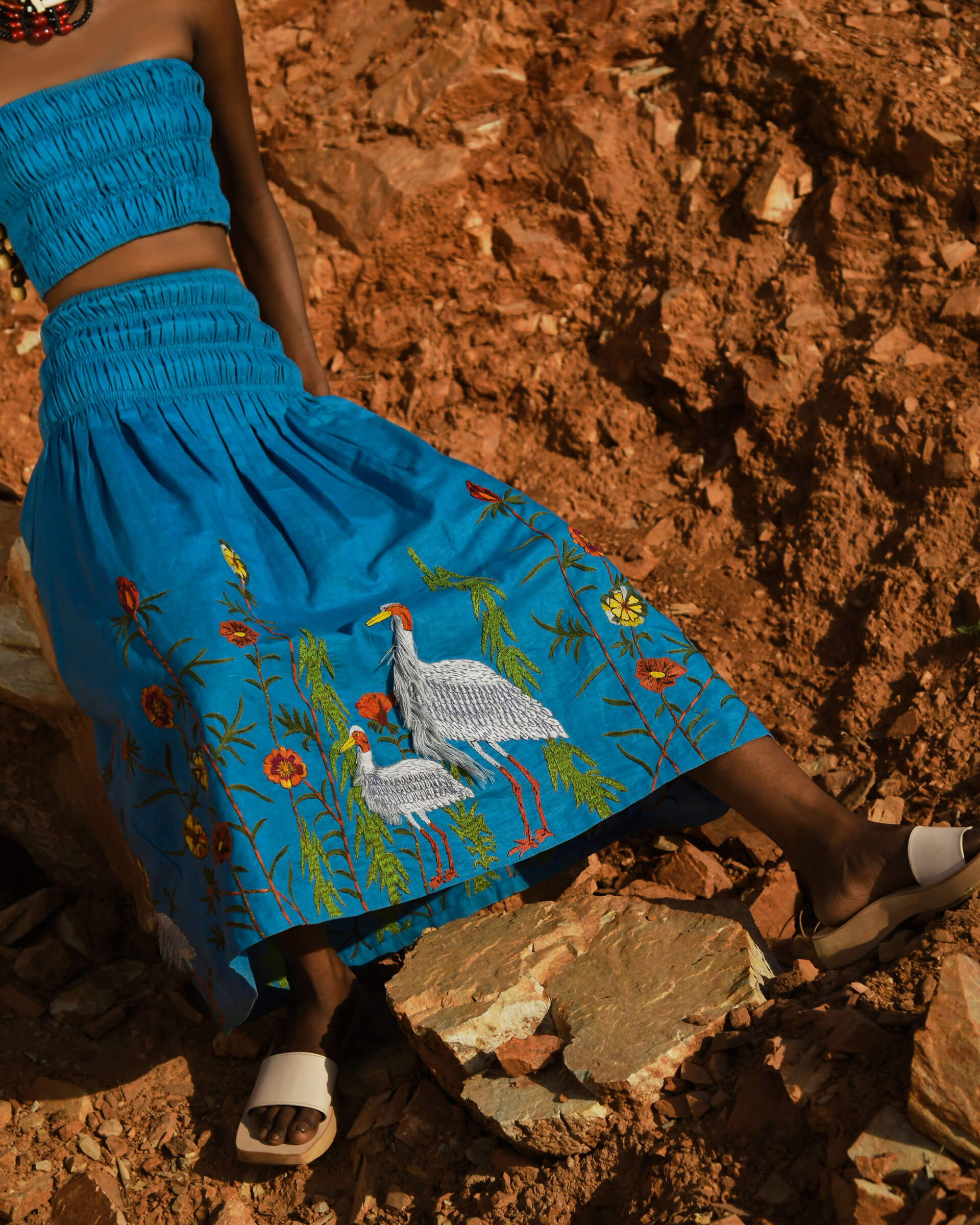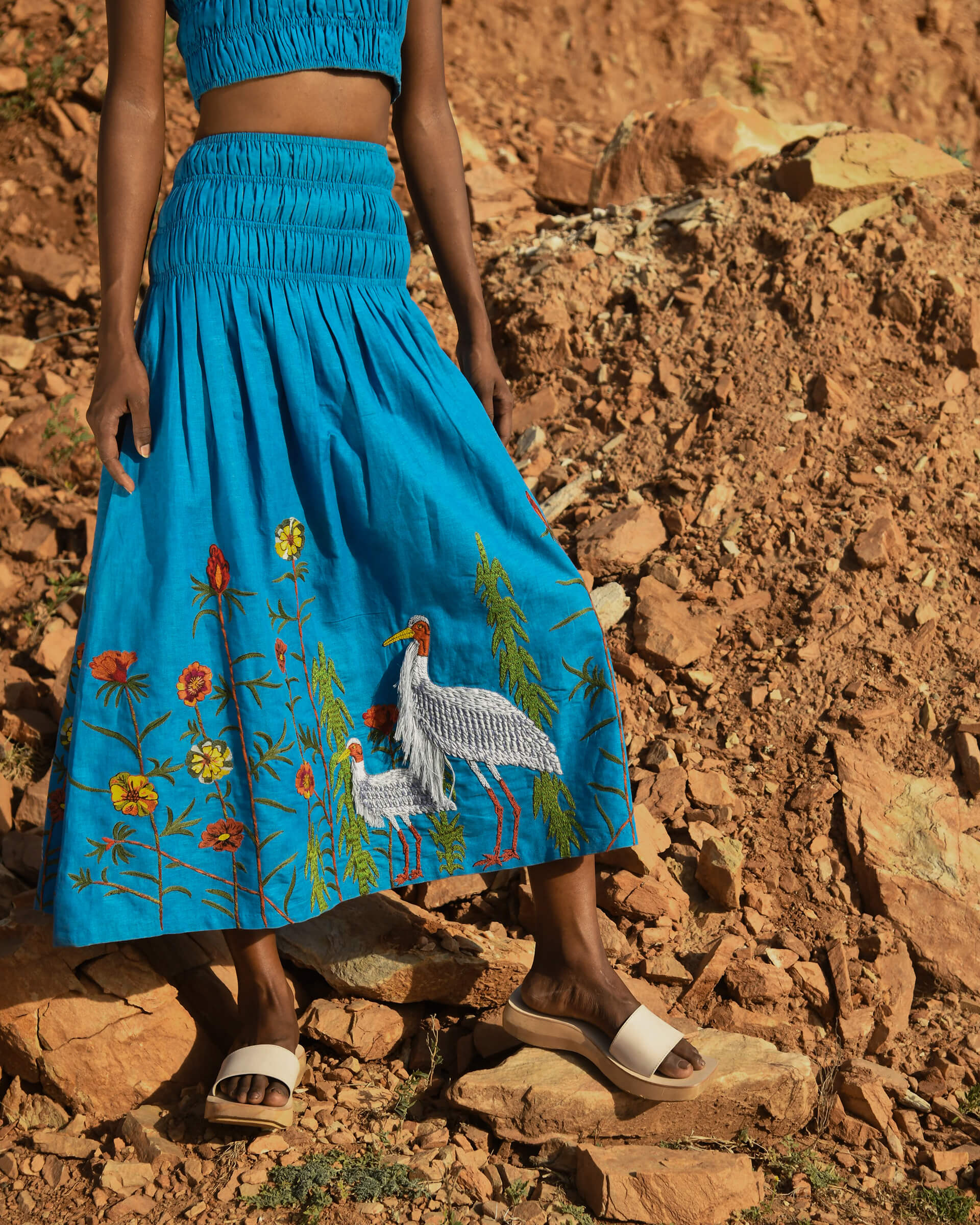 A wild tapestry adorns the Anga Skirt. The garment is a hand-embroidered painting, featuring storks amongst a lush, floral scenery. With its smocking detail on the waist, this A-line midi skirt is as comfortable as it is dreamy. Pair it with the Anga Crop Top to complete the look.