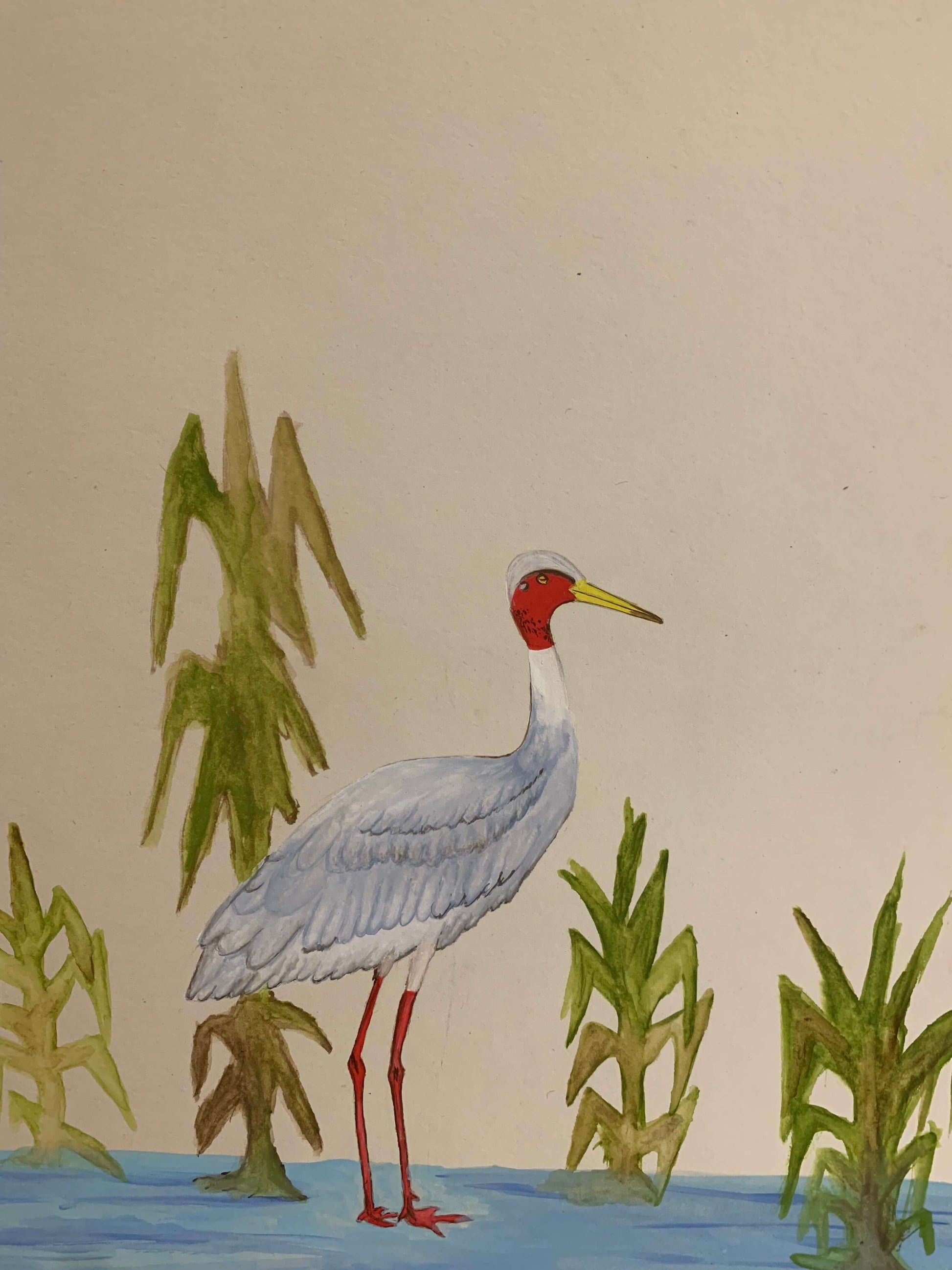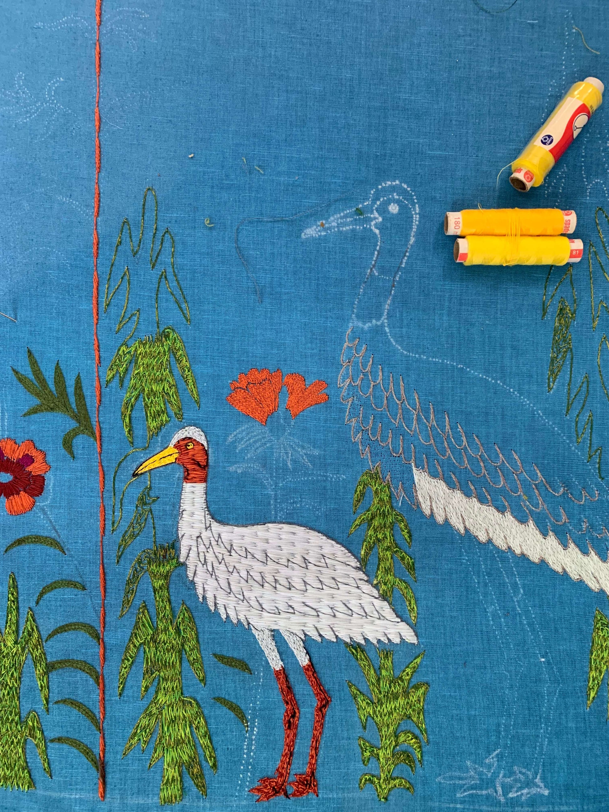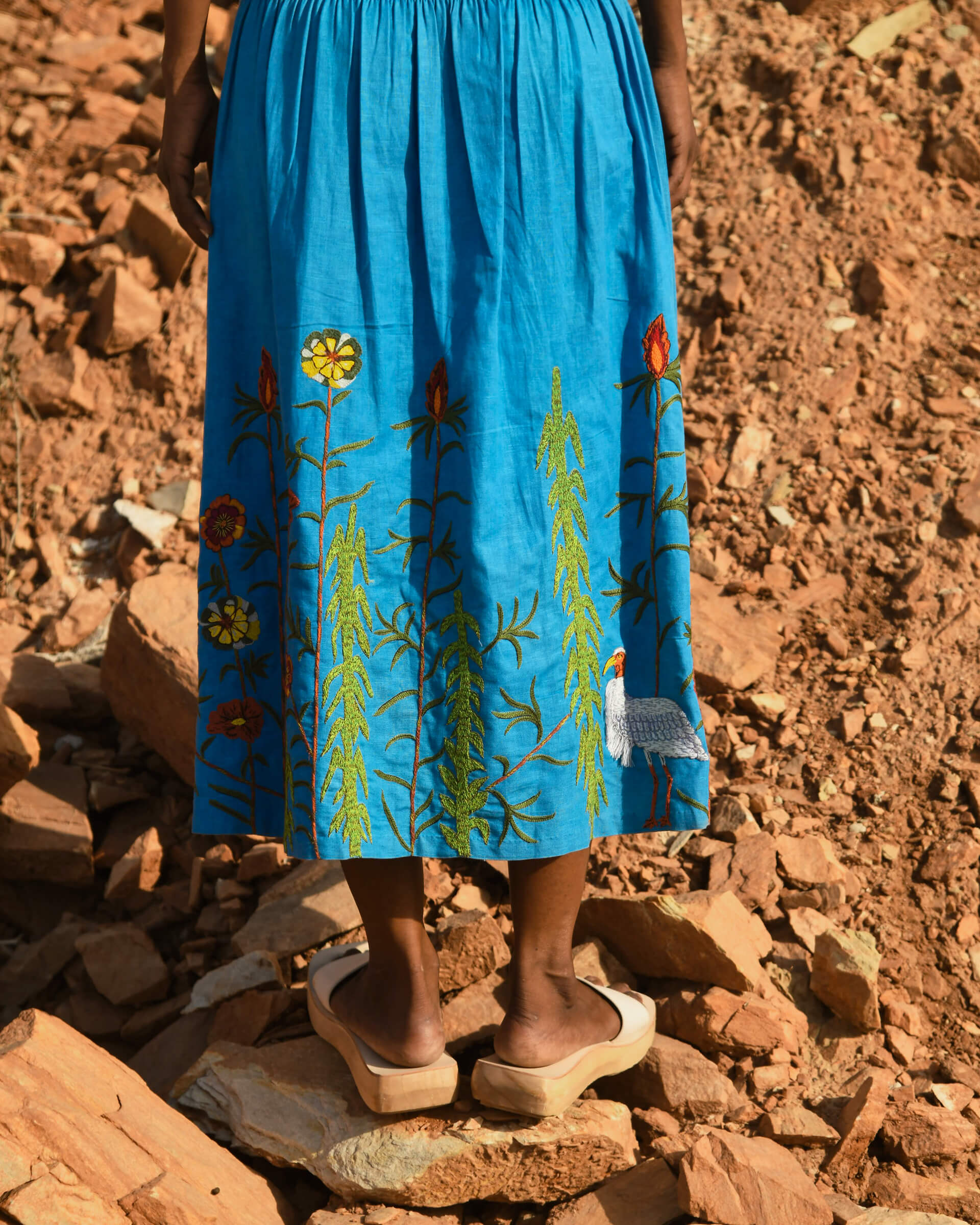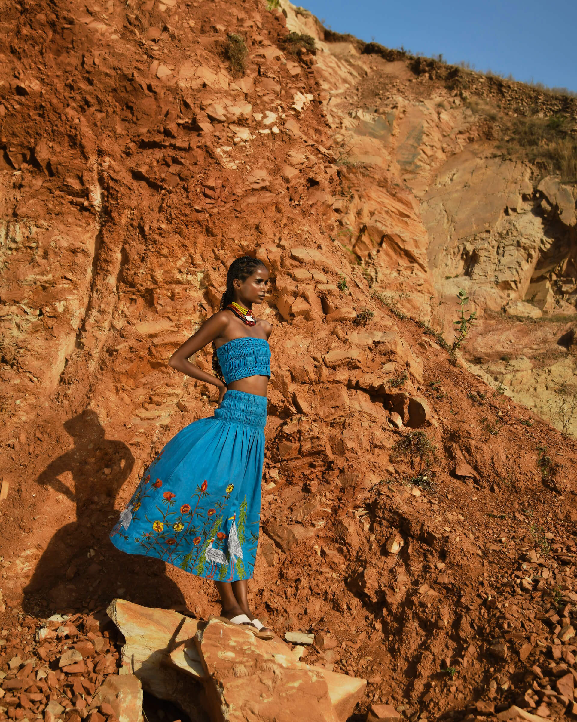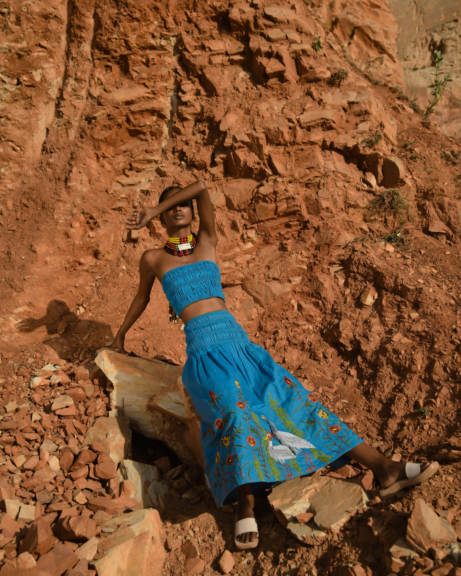 A wild tapestry adorns the Anga Skirt. The garment is a hand-embroidered painting, featuring storks amongst a lush, floral scenery. With its smocking detail on the waist, this A-line midi skirt is as comfortable as it is dreamy. Pair it with the Anga Crop Top to complete the look.