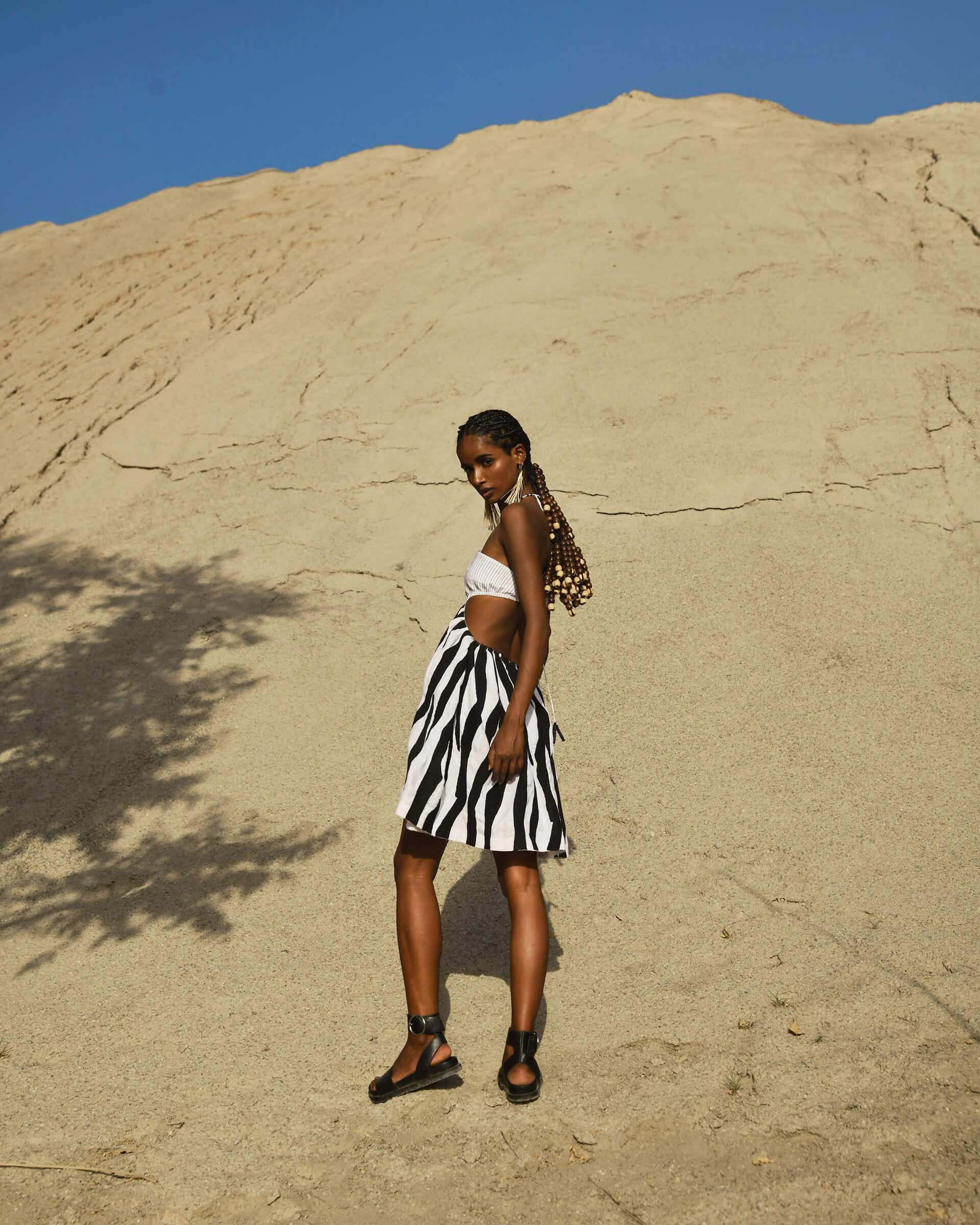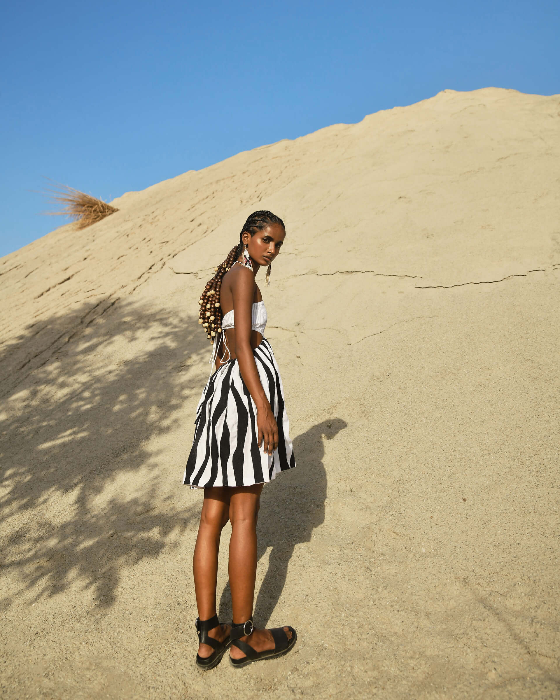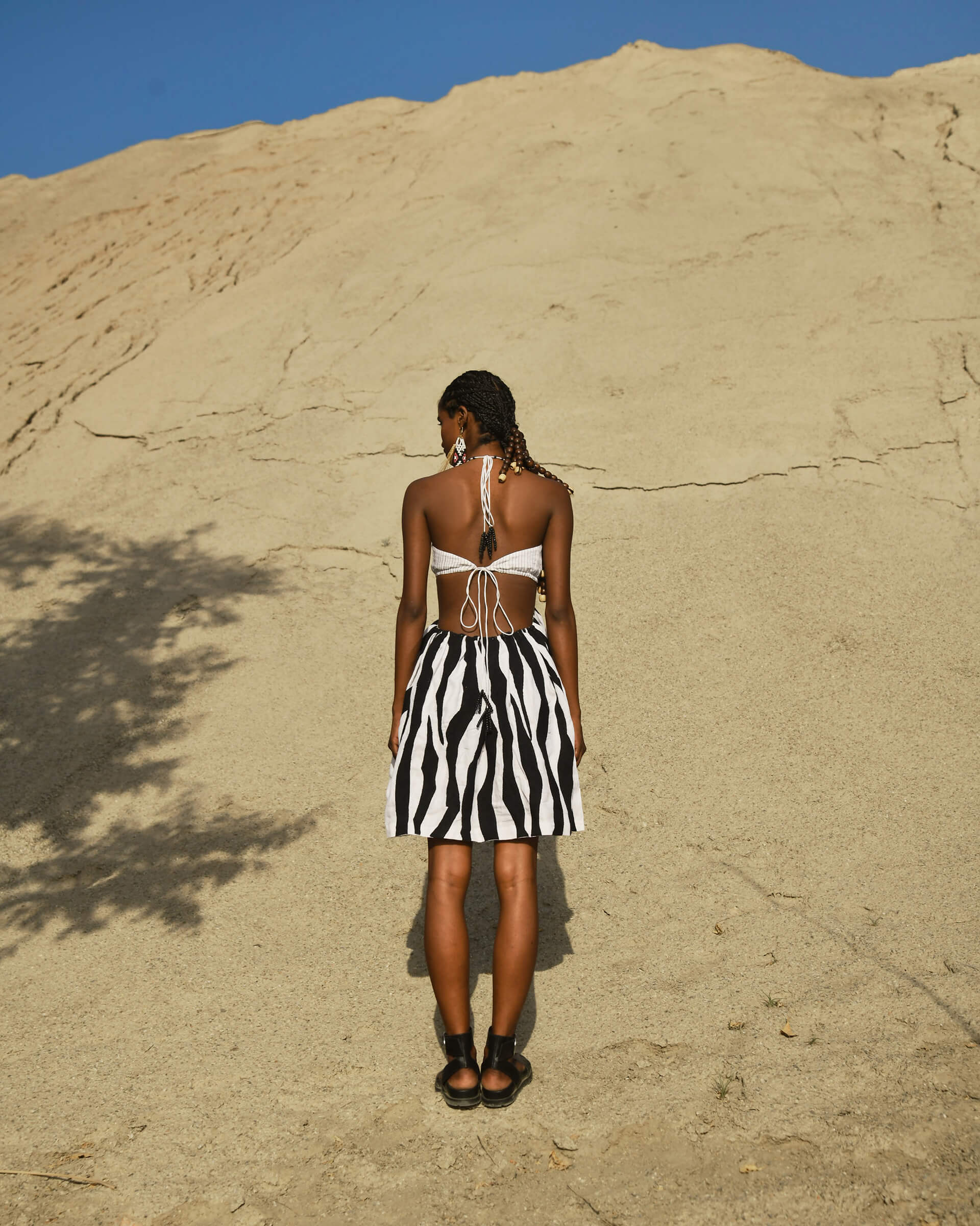 We call Chioma our 'Little Black & White Dress'. The hand-embroidered stripes on this beauty take up to two weeks to create, and are directly inspired by the gorgeous zebras of Africa. Chioma is almost a backless garment due to its intricately made tie-up back. Its halter strings are decorated with beads. This is the perfect party dress for a balmy summer evening.